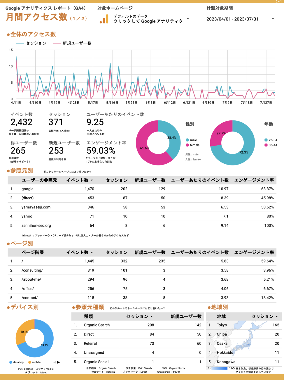 Googleが提供するLooker Studio(旧:データポータル)を利用して、あなたが解析中のホームページの解析レポートを書き出します。
